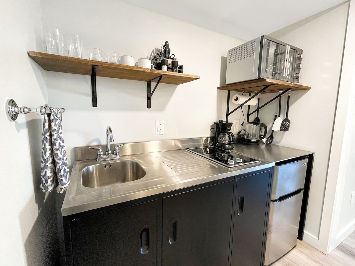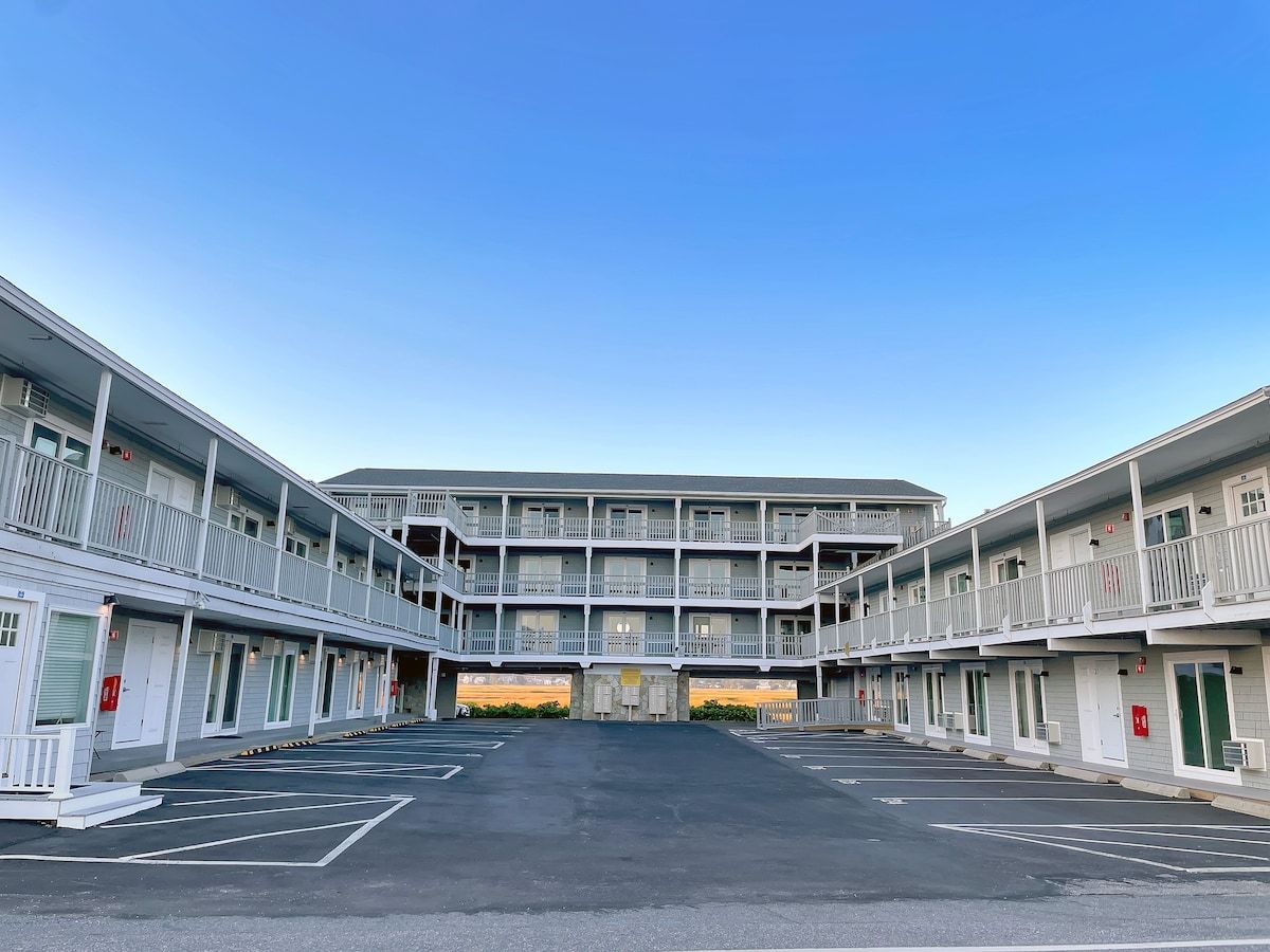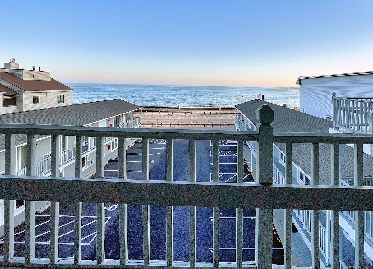 This newly renovated condo has perfect views of the beach and is just a couple steps away from having your feet in the sand. Enjoy the sunrise from the living room and the tidal marsh and sunset from the sitting area off the bedroom. The unit has a modern kitchenette, a full bath, and a cozy seating area off the bedroom. The large deck out front lets you take in the stunning views of the ocean and most everything Hampton Beach has to offer is nearby. This unit can sleep up to 4 people.
